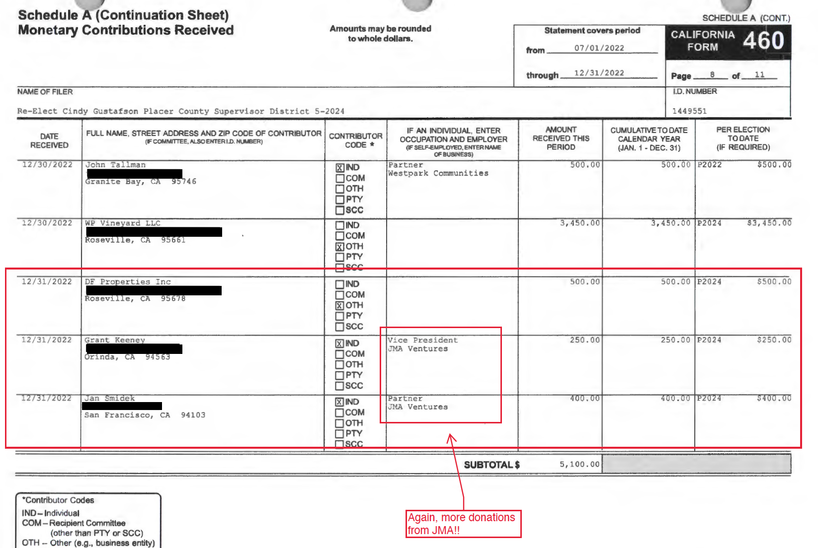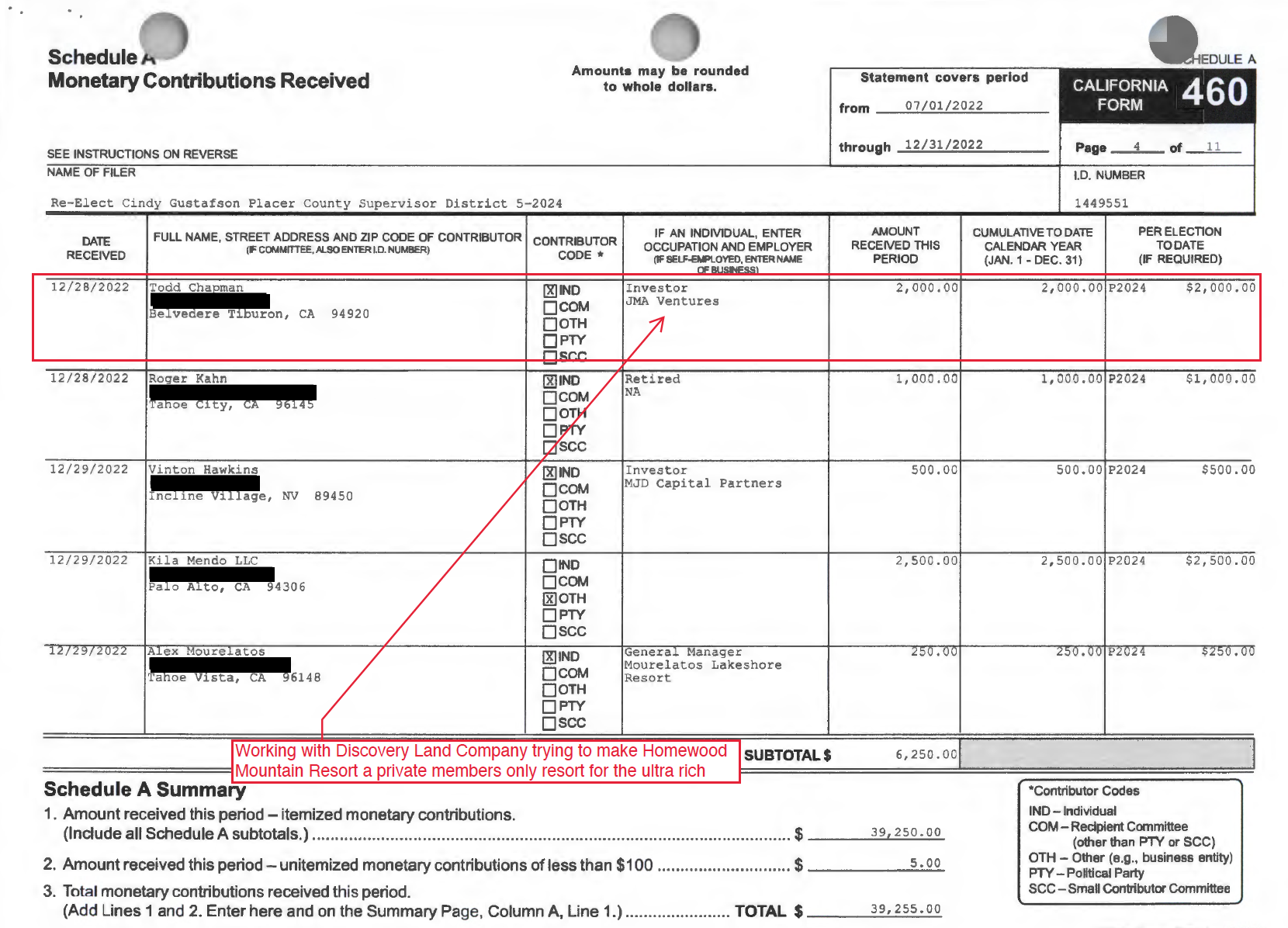 To put it simply, Cindy accepted donations from JMA Ventures (JMA), who along with Discovery Land Company (DLC), is trying to privatize Homewood Mountain Resort (see donation reports below). Cindy has never denounced the privatization nor publicly stated she will not approve the proposed changes unless the public has guaranteed access in perpetuity. As a member of the TRPA and Placer County Board of Supervisors she should be protecting us from this overreach!!