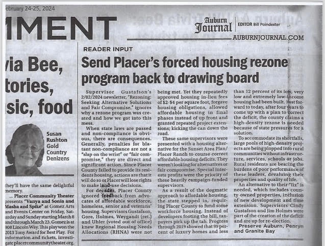 The issue of re-zoning parcels for high density affordable housing is a very hot topic in Placer County. Cindy recently voted in favor of rezoning 42 parcels with a concentration in Auburn, Penryn and Granite Bay. This new RM30 zone will allow up to 30 units per acre. These massive 3-5 story apartments will be randomly “plopped” within established communities, near single family homes and most likely result in new taxes to pay for premature infrastructure upgrades. Most, if not all, of the parcels do not meet state guidelines for parcel selection; they are not near services, public transportation, jobs, medical or adequate infrastructure. These parcels also violate new state legislation prohibiting the creation of communities of poverty and over concentration. The cause of the rezone is not only decades of what we see as illegitimate developer forgiveness of their 10% affordable housing obligation but approval of the Placer Ranch/Sunset Area Specific Plans (PRSP) where the identified shortfall could easily have been corrected.